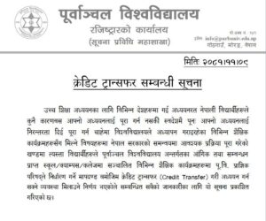 काठमाडौँ। पूर्वाञ्चल विश्वविद्यालय (पीयू)ले अध्ययन पूरा नगरी फर्किएका विद्यार्थीलाई पढाउने भएको छ। पीयूले सार्वजनिक सूचना निकाल्दै बीचैमा कलेज छाडेकालाई थप अध्ययन गराउने जानकारी दिएको छ।