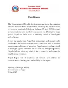 काठमाडौं। नेपाल सबै प्रकारका आतंकवादविरुद्ध उभिने स्पष्ट पारेको छ। भारत-पाकिस्तान द्वन्द्व चर्किरहँदा परराष्ट्र मन्त्रालयले आज एक विज्ञप्ति जारी गर्दै पहलगाममा अप्रिल २२ मा भएको आतंकवादी आक्रमणपछि बढेको तनावले नेपाल सरकार चिन्तित रहेको जनाएको छ।