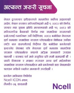 काठमाडौँ । दूरसञ्चार सेवा प्रदायक कम्पनी एनसेलले नेपालमा दर्ता नभएका सामाजिक सञ्जालका प्लेटफर्महरू नचल्ने सूचना जारी गरेको छ ।
