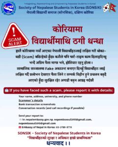 `हालै कोरियामा नयाँ आएका विद्यार्थी लक्षित धोका–धडी (Scam) बढिरहेको र कसैले पनि पार्ट-टाइम काम दिलाइदिन्छु भन्दै अग्रिम पैसा माग्ने गिरोहबाट होसियार रहनु होला,´ सोनसिकले सूचनामार्फत भनेको छ।