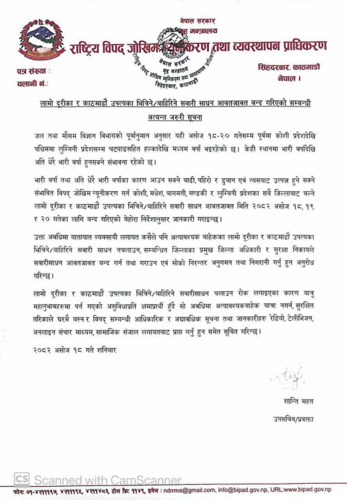 ‘सबै जिल्लाबाट चल्ने लामो दूरीका र काठमाडौं उपत्यका भित्रिने/बाहिरिने सवारी साधन आवतजावत मिति २०८२ असोज १८, १९ र २० गतेका लागि बन्द गरिएको बेहोरा निर्देशानुसार जानकारी गराइन्छ’, प्राधिकरणको सूचनामा भनिएको छ ।