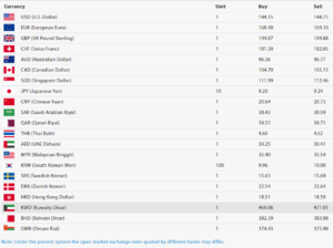 काठमाडौँ। नेपाल राष्ट्र बैंकले आजका लागि विदेशी मुद्राहरूको विनिमयदर निर्धारण गरेको छ। आज अमेरिकी डलर १ को खरिददर १४४ रुपैयाँ ०२ पैसा र बिक्रीदर १४४ रुपैयाँ ६२ पैसा छ।