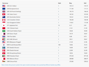 काठमाडौँ। नेपाल राष्ट्र बैंकले आज ९मंगलबार० का लागि विदेशी मुद्राहरूको विनिमयदर निर्धारण गरेको छ। राष्ट्र बैंकका अनुसार आज अमेरिकी डलर १ को खरिददर १४५ रुपैयाँ १२ पैसा र बिक्रीदर १४५ रुपैयाँ ७२ पैसा छ। हिजो अमेरिकी डलर १ को खरिददर १४५ रुपैयाँ २८ पैसा र बिक्रीदर १४५ रुपैयाँ ८८ पैसा थियो।